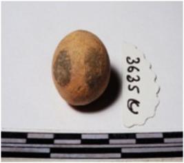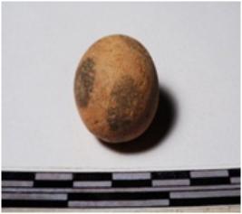 | Description / विवरण | A terracotta round in shape sling ball, painted with black showing dots on surface of smooth surface. |
