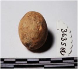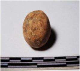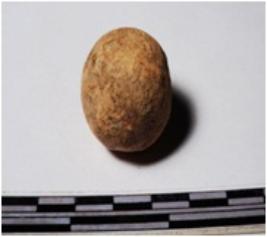 | Description / विवरण | A terracotta round in shape sling ball of rough surface. |