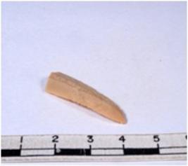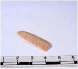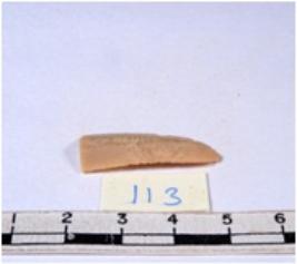 | Description / विवरण | A fragment of a rectangular shaped chert blade showing dorsal sides with sharp cutting edges having smooth surface and triangular section. |