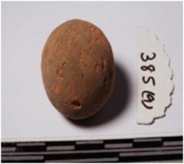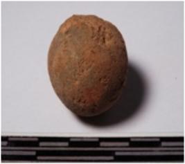 | Description / विवरण | A terracotta sling ball, round in shape of smooth surface. |