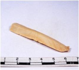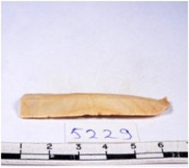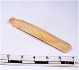 | Description / विवरण | A fragment of a rectangular shaped chert blade showing dorsal sides with sharp cutting edges having smooth surface and triangular section. |