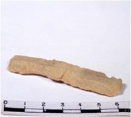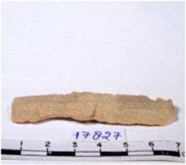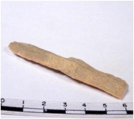 | Description / विवरण | A fragment of a rectangular shaped chert blade showing dorsal sides with sharp cutting edges having smooth surface and triangular section. |