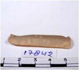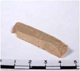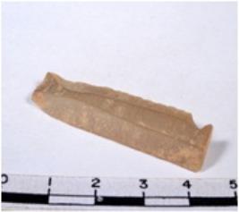 | Description / विवरण | A fragment of a rectangular shaped chert blade showing dorsal sides with sharp cutting edges having smooth surface and uneven section. |