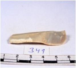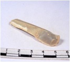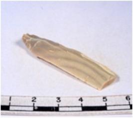 | Description / विवरण | A fragment of a rectangular shaped chert blade showing dorsal sides with sharp cutting edges having smooth surface and triangular section. |