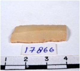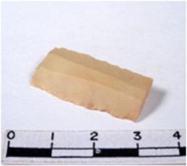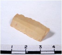 | Description / विवरण | A fragment of a rectangular shaped chert blade showing flat sides with fine surface and oval like section. |