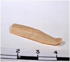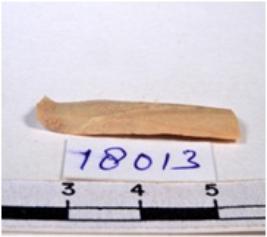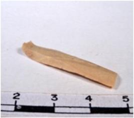 | Description / विवरण | A fragment of a rectangular shaped chert blade showing dorsal sides with sharp cutting edges having smooth surface and triangular section. |