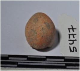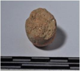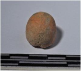 | Description / विवरण | A fragment of a terracotta round shaped sling ball of smooth surface. |