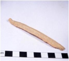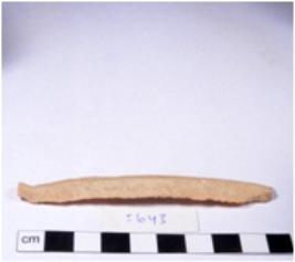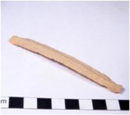 | Description / विवरण | A fragment of a rectangular shaped chert blade showing dorsal sides with sharp cutting edges having smooth surface and triangular section. |