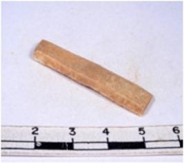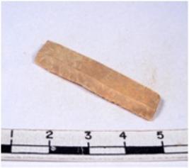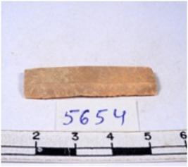 | Description / विवरण | A fragment of a rectangular shaped chert blade showing dorsal sides with sharp cutting edges having smooth surface and triangular section. |