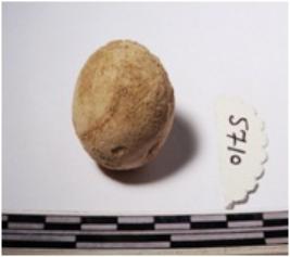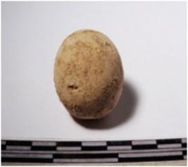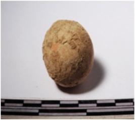 | Description / विवरण | A terracotta round shaped sling ball of rough surface. |
