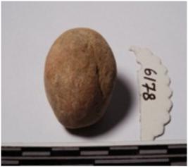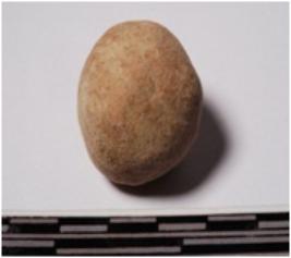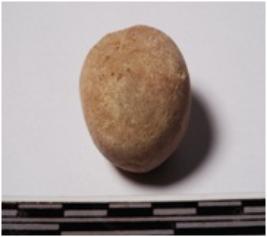 | Description / विवरण | A terracotta uneven shaped sling ball of smooth surface. |