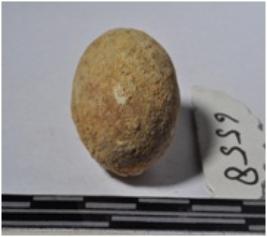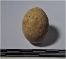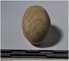 | Description / विवरण | A terracotta sling ball, round in shaped and rough surface. |
