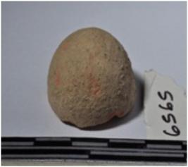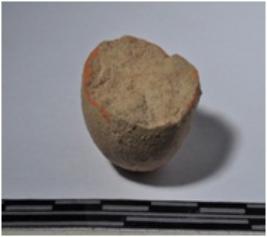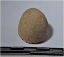 | Description / विवरण | A fragment of a terracotta sling ball of smooth surface. |