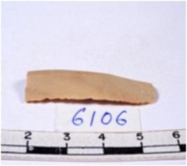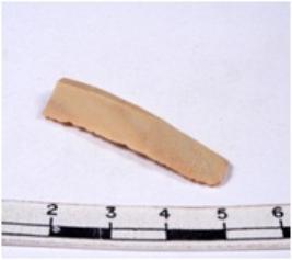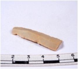 | Description / विवरण | A fragment of a rectangular shaped chert blade showing dorsal sides with sharp cutting edges having smooth surface and triangular section. |