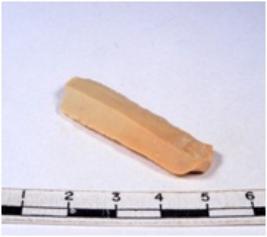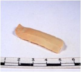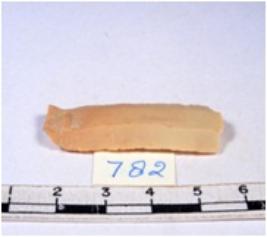 | Description / विवरण | A fragment of a rectangular shaped chert blade showing dorsal sides with sharp cutting edges having smooth surface and triangular section. |