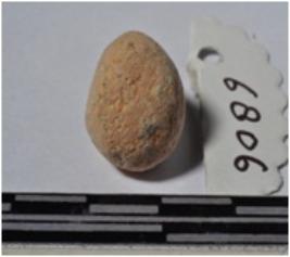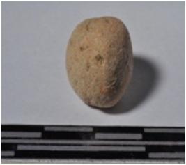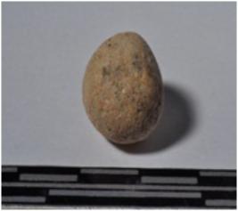 | Description / विवरण | A terracotta sling ball, round in shaped and rough surface. |