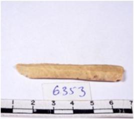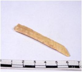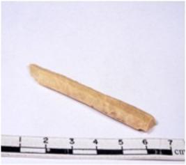 | Description / विवरण | A fragment of a rectangular shaped chert blade showing parallel sides with sharp edges having smooth surface and triangular section. |