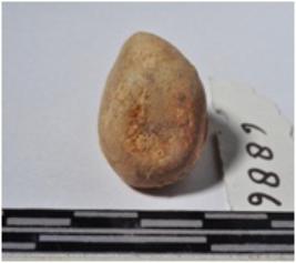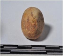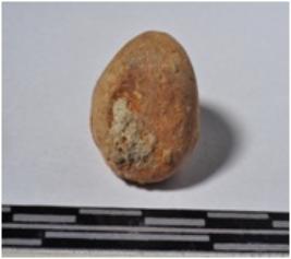 | Description / विवरण | A terracotta sling ball, round shaped and rough surface. |