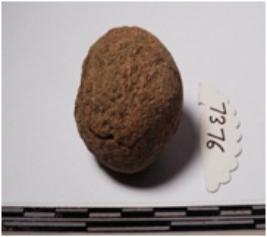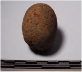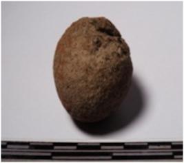 | Description / विवरण | A terracotta sling ball round in shape of rough surface. |