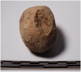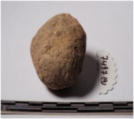 | Description / विवरण | A fragment of a terracotta uneven shaped ball of rough surface. |