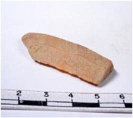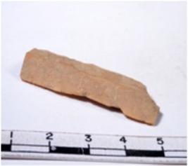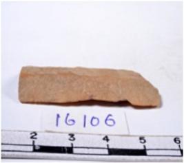 | Description / विवरण | A fragment of a rectangular shaped chert blade showing dorsal sides with sharp cutting edges having smooth surface and triangular section. |