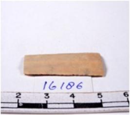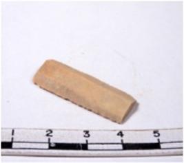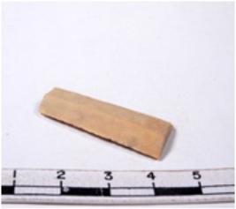 | Description / विवरण | A fragment of a rectangular shaped chert blade showing dorsal sides with sharp cutting edges having smooth surface and triangular section. |