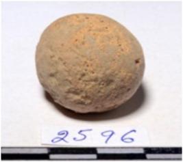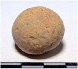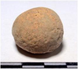 | Description / विवरण | A terracotta sling ball round in shape of rough surface. |