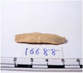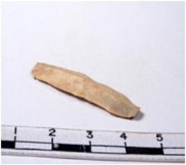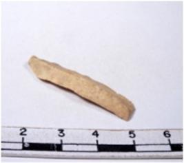 | Description / विवरण | A fragment of a rectangular shaped chert blade showing dorsal sides with sharp cutting edges having smooth surface and triangular section. |