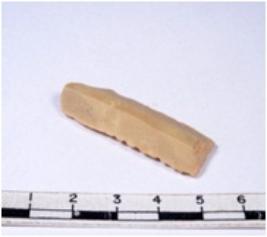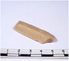 | Description / विवरण | A fragment of a rectangular shaped chert blade showing dorsal sides with sharp cutting edges having smooth surface and triangular section. |