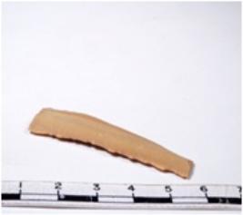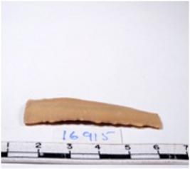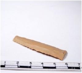 | Description / विवरण | A fragment of a rectangular shaped chert blade showing parallel sides with sharp cutting edges having smooth surface and uneven section. |