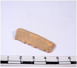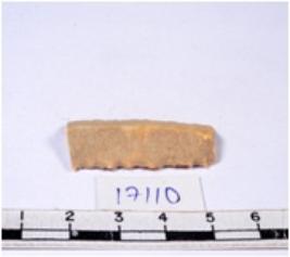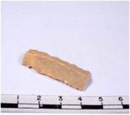 | Description / विवरण | A fragment of a rectangular shaped chert blade showing dorsal sides with sharp cutting edges having smooth surface and triangular section. |
