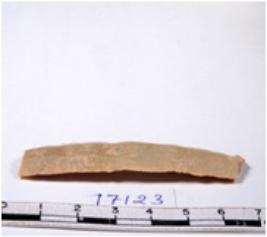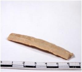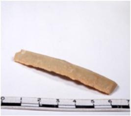 | Description / विवरण | A fragment of a rectangular shaped chert blade showing dorsal sides with sharp edges having smooth surface and triangular section. |