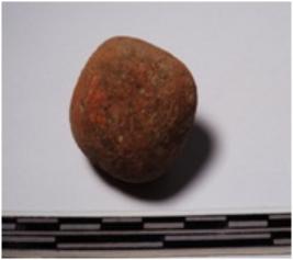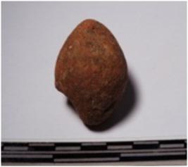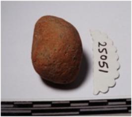 | Description / विवरण | A terracotta uneven shaped sling ball, circular in section of smooth surface. |