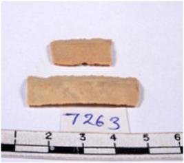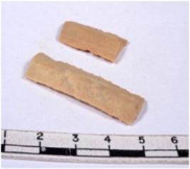| Description / विवरण | A fragment of a rectangular shaped chert blade showing dorsal sides with sharp cutting edges having smooth surface and triangular section. |