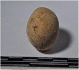| Description / विवरण | A terracotta sling ball, round in shaped and rough surface. |