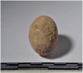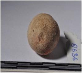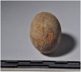 | Description / विवरण | A terracotta sling ball round in shape of smooth surface. |
