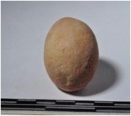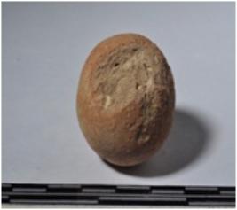 | Description / विवरण | A terracotta sling ball, round in shaped and rough surface. |