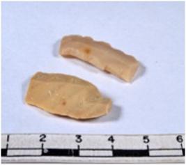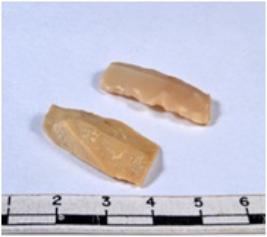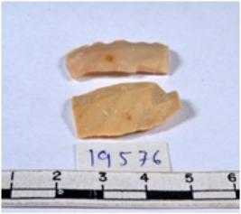 | Description / विवरण | A fragment of a rectangular shaped chert blade showing dorsal sides with sharp cutting edges having smooth surface and triangular section. |