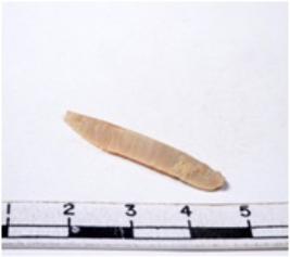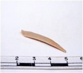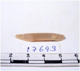 | Description / विवरण | A fragment of a rectangular shaped chert blade showing dorsal sides with sharp edges having smooth surface and triangular section. |