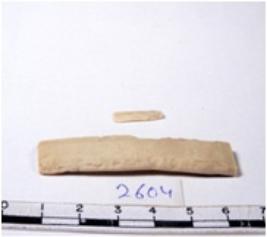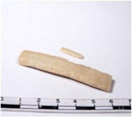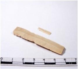 | Description / विवरण | A fragment of a rectangular shaped chert blade showing dorsal sides with sharp cutting edges having smooth surface and triangular section. |
