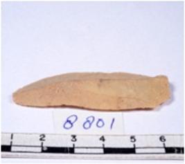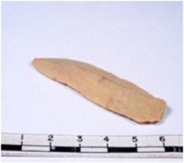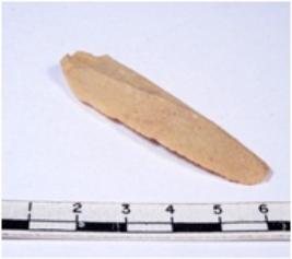 | Description / विवरण | A fragment of a rectangular shaped chert blade showing dorsal sides with sharp cutting edges having smooth surface and triangular section. |