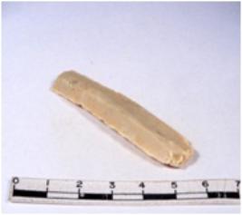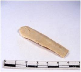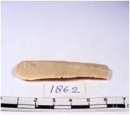 | Description / विवरण | A fragment of a rectangular shaped chert blade showing dorsal sides with sharp cutting edges having smooth surface and triangular section. |
