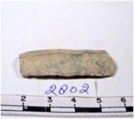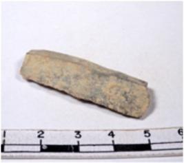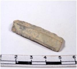 | Description / विवरण | A fragment of a rectangular shaped chert blade showing dorsal sideswith sharp edges having smooth surface and triangular section. |