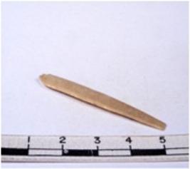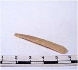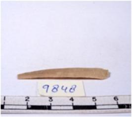 | Description / विवरण | A fragment of a rectangular shaped chert blade showing dorsal sides with sharp edges having smooth surface and triangular section. |