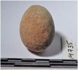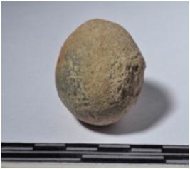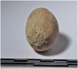 | Description / विवरण | A terracotta sling ball, round in shape and rough surface. |