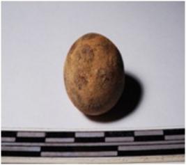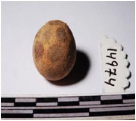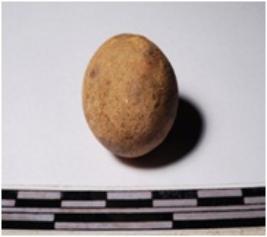 | Description / विवरण | A terracotta round in shaped sling ball, painted with black showing dots on enterior, circular in section of smooth surface. |