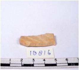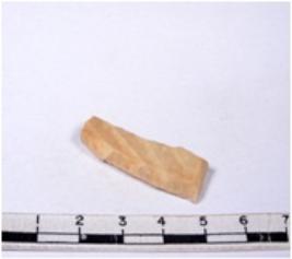 | Description / विवरण | A fragment of a rectangular shaped chert blade showing dorsal sides with sharp cutting edges having smooth surface and triangular section. |