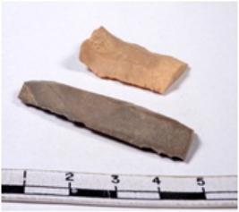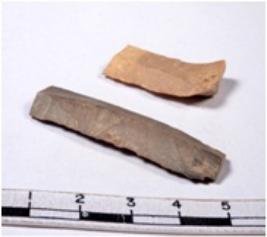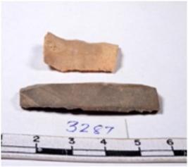 | Description / विवरण | A fragment of a rectangular shaped chert blade showing dorsal sides with sharp cutting edges having smooth surface and triangular section. |