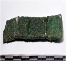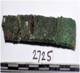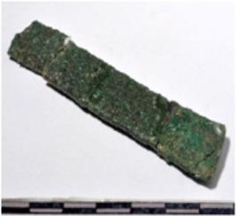 | Description / विवरण | A fragment of a mended copper chisel broken from both end of rough surface. |