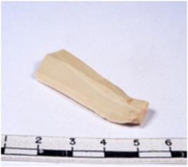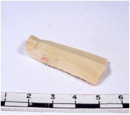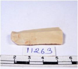 | Description / विवरण | A fragment of a rectangular shaped chert blade showing dorsal sides with sharp cutting edges having smooth surface and triangular section. |